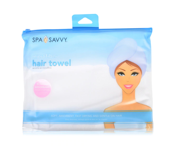 The Spa Savvy Hair Towel is made of 100% microfiber which is lightweight and 8x more absorbent than cotton. It holds 4x the amount of water of non-microfiber towels and dries hair gently and efficiently with less frizz, split ends and hair breakage. Precise size wraps perfectly for superior comfort and hands-free hair drying